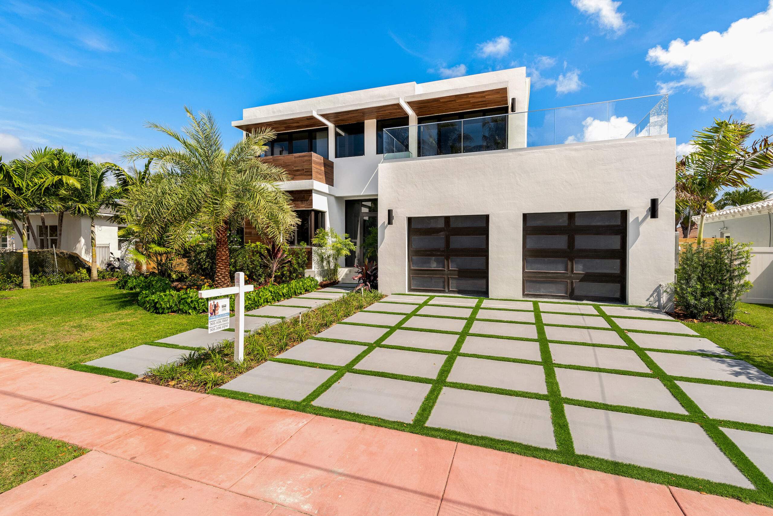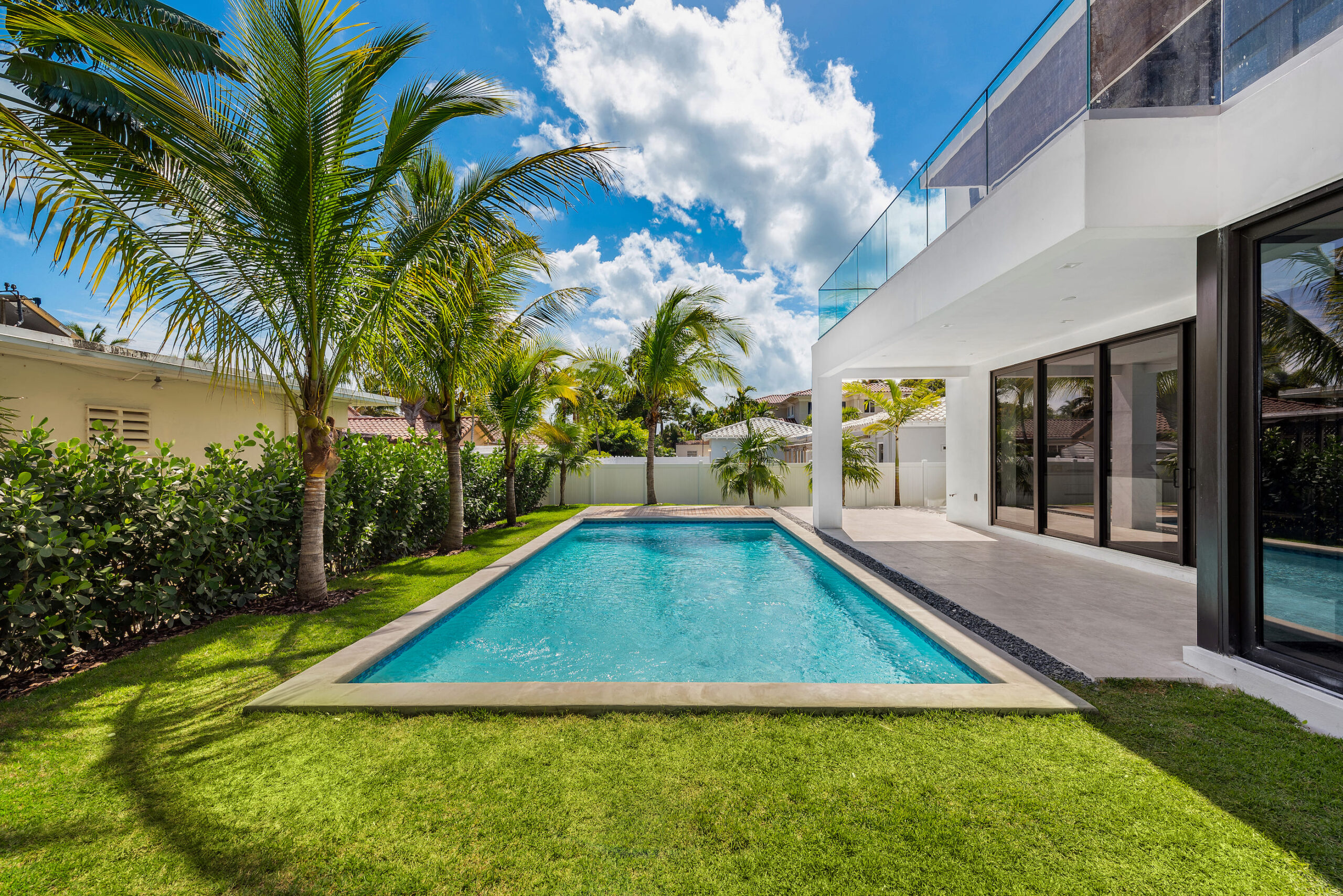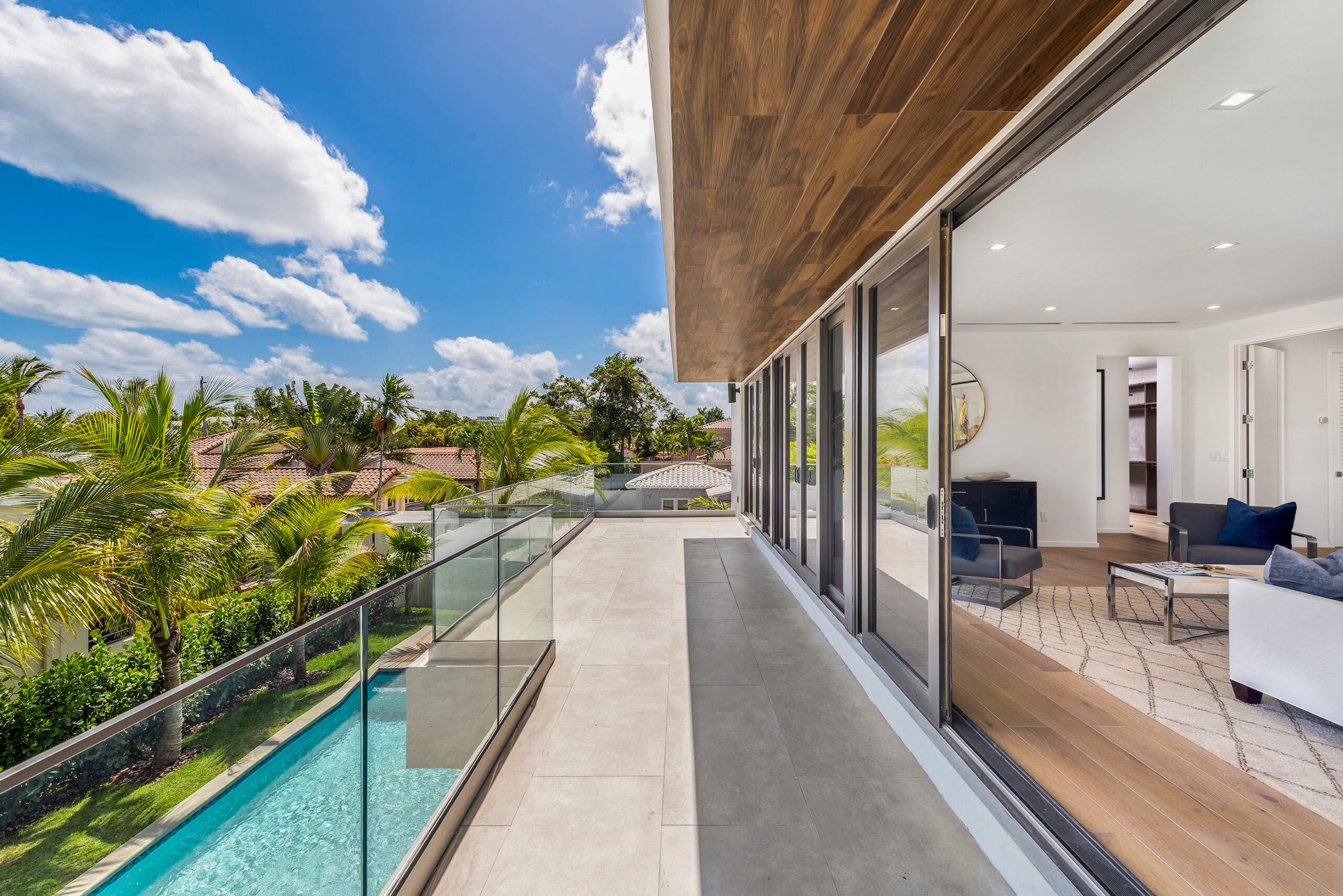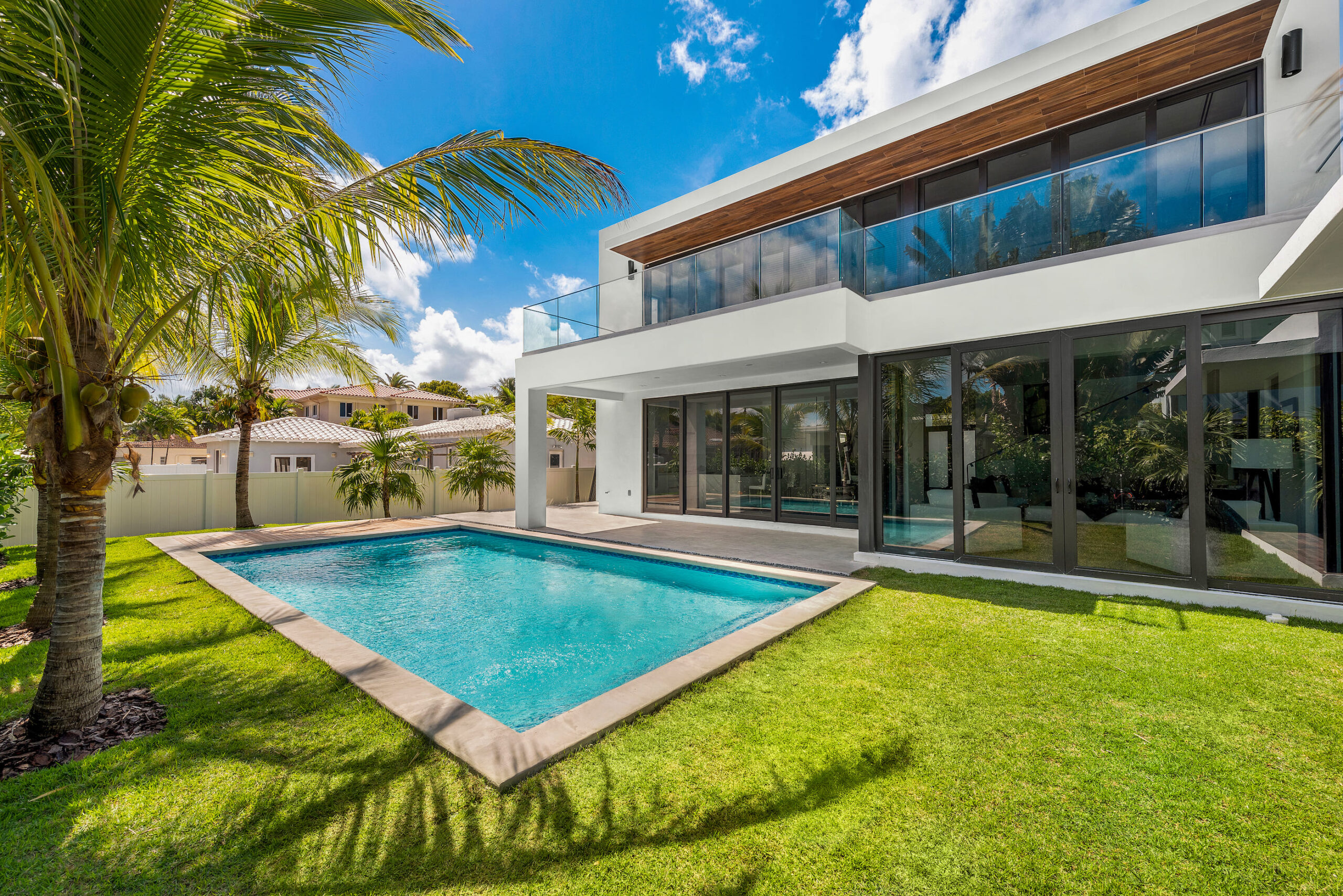 New construction contemporary smart home! Soaring ceilings & views of the sparkling pool greet you as you enter this 5BR/5 +2 BA modern masterpiece. This home boasts wide plank oak floors & an abundance of natural light throughout, creating a bright & tropical ambiance w/ oversized sliding hurricane impact doors which frame the open kitchen and living area.