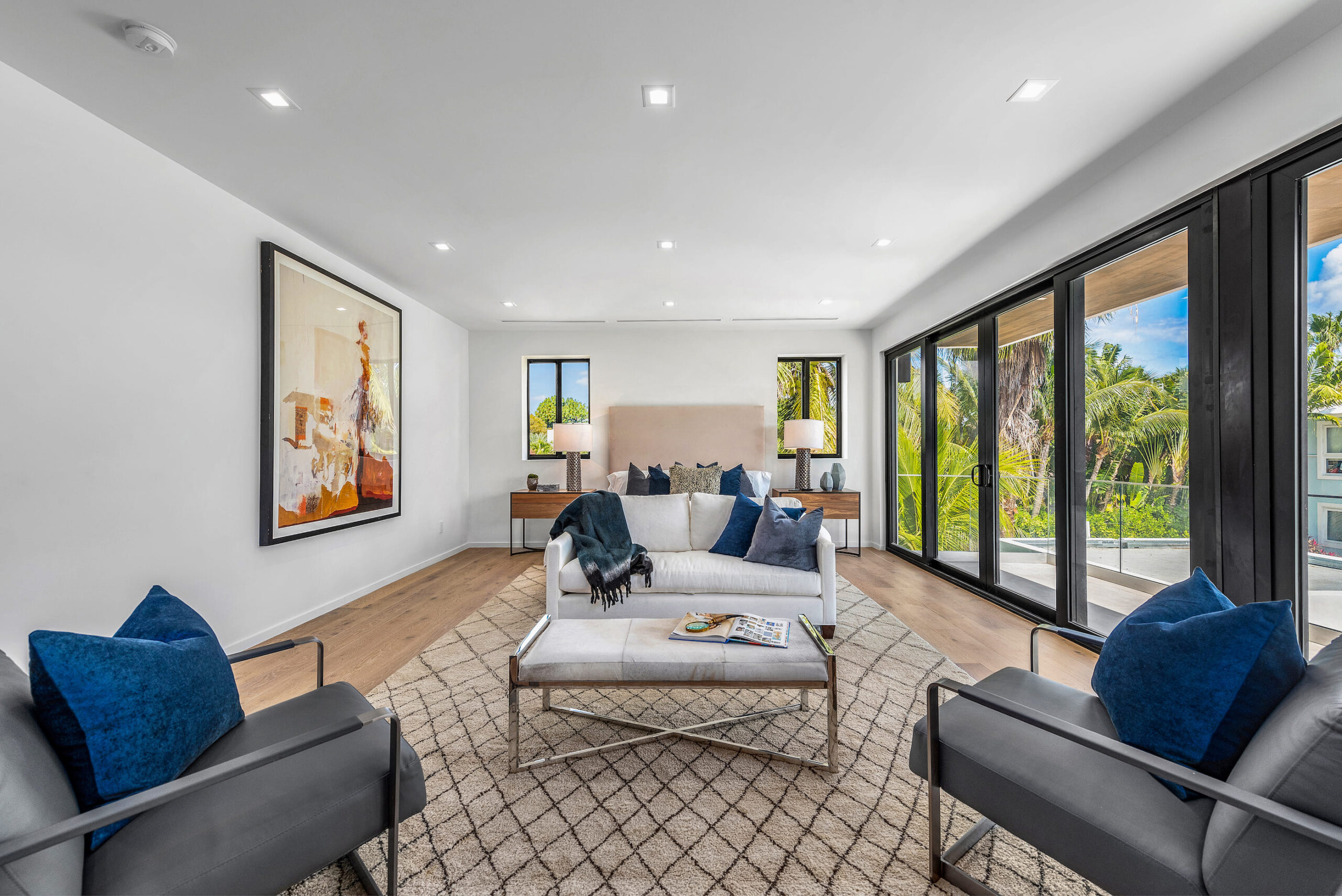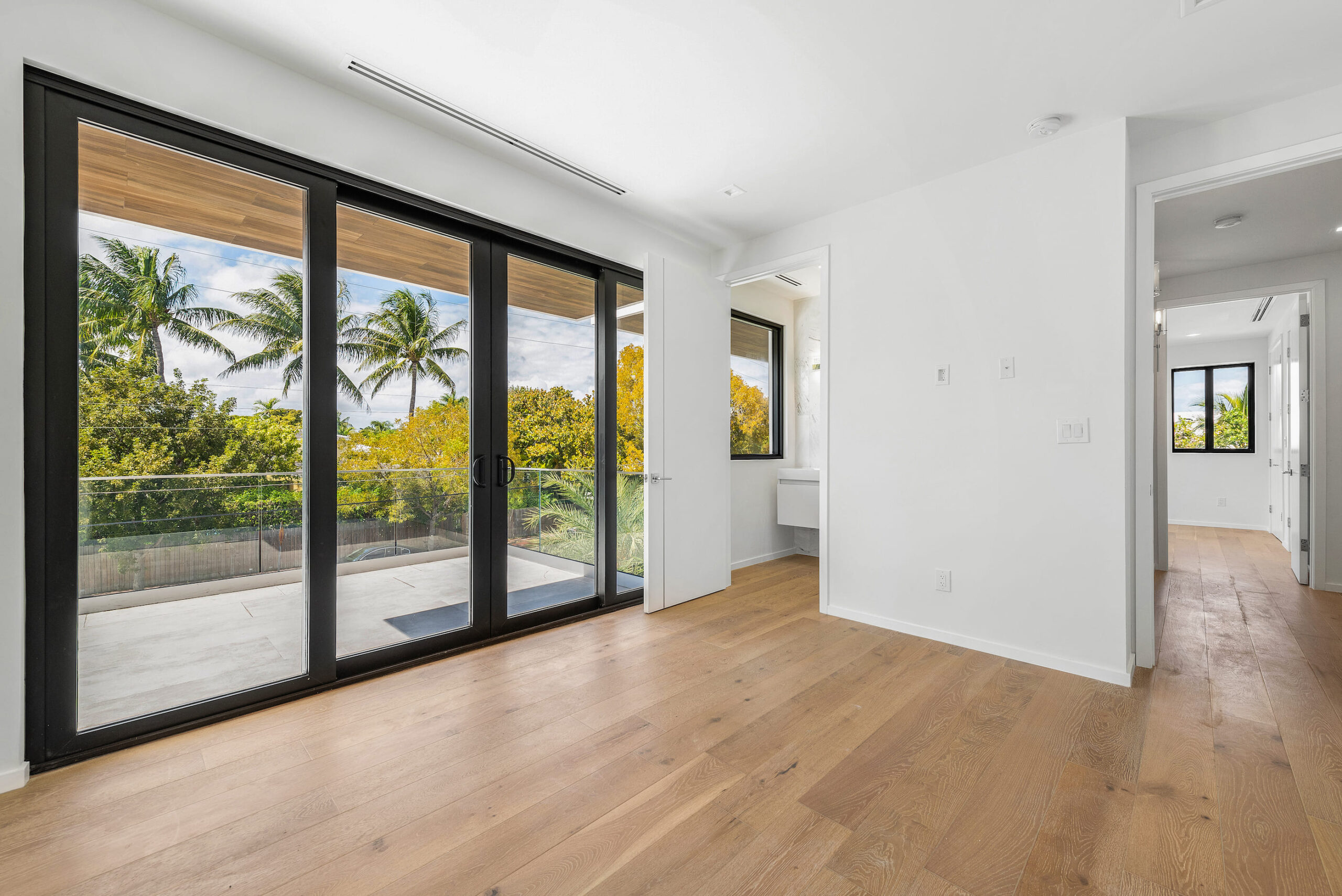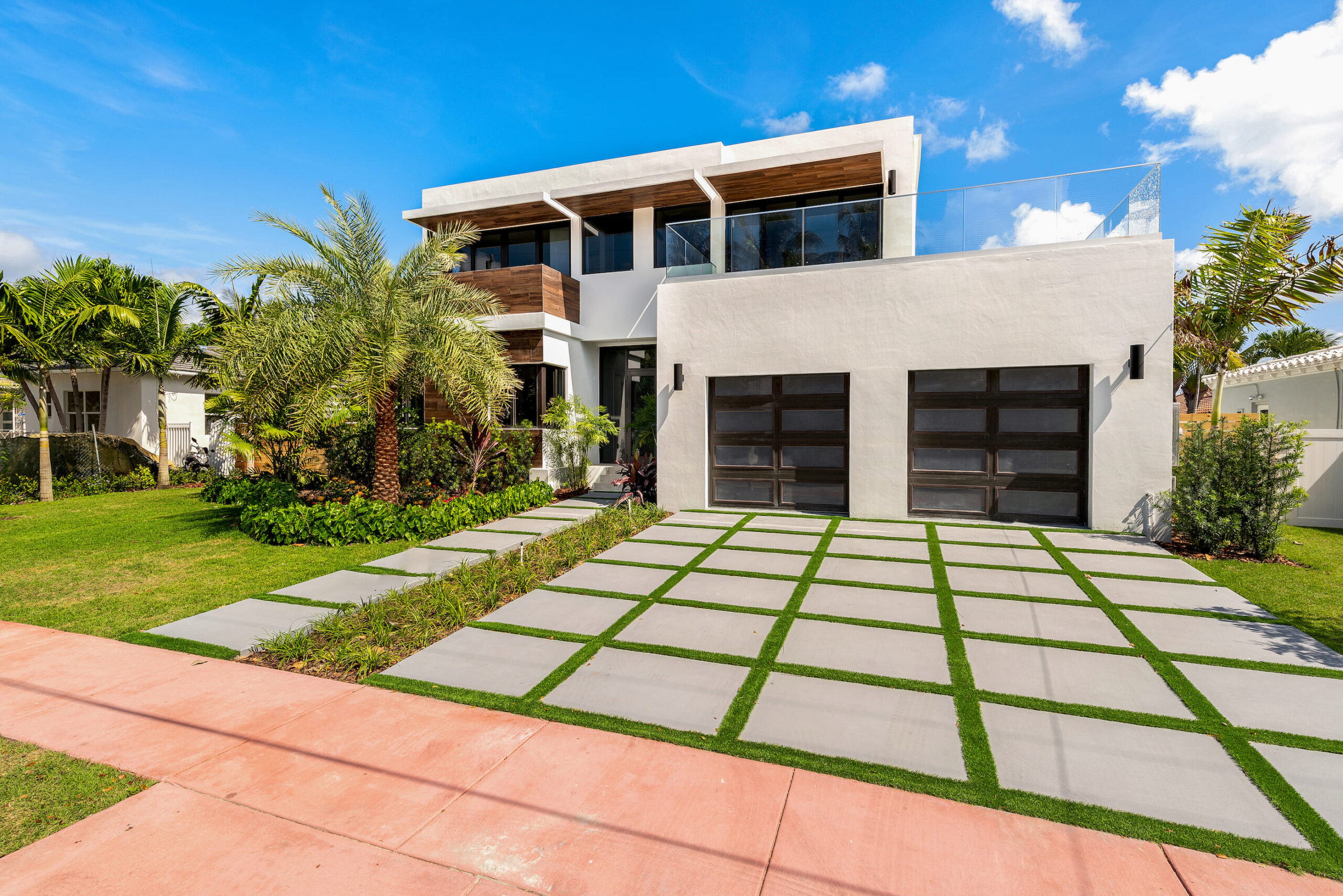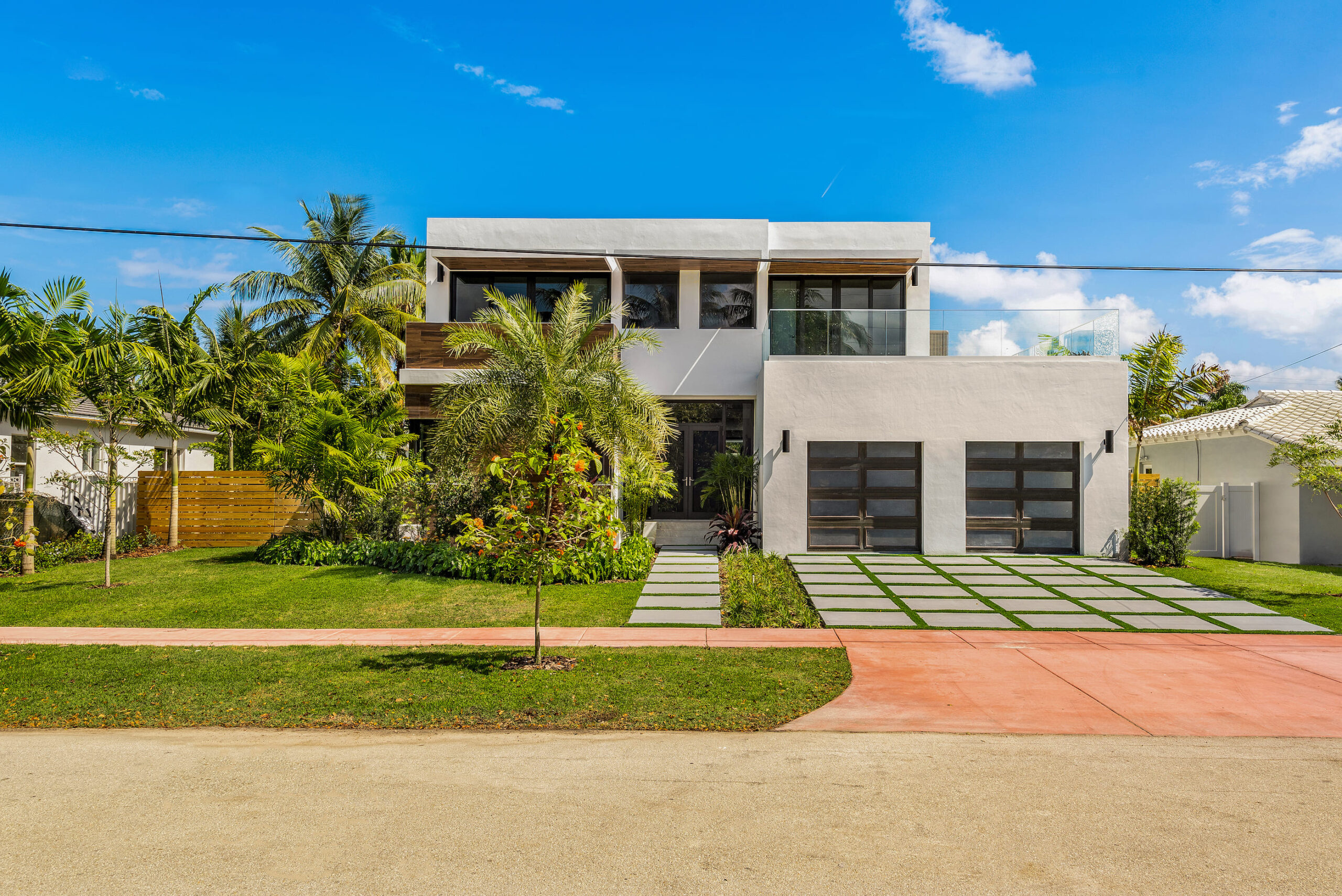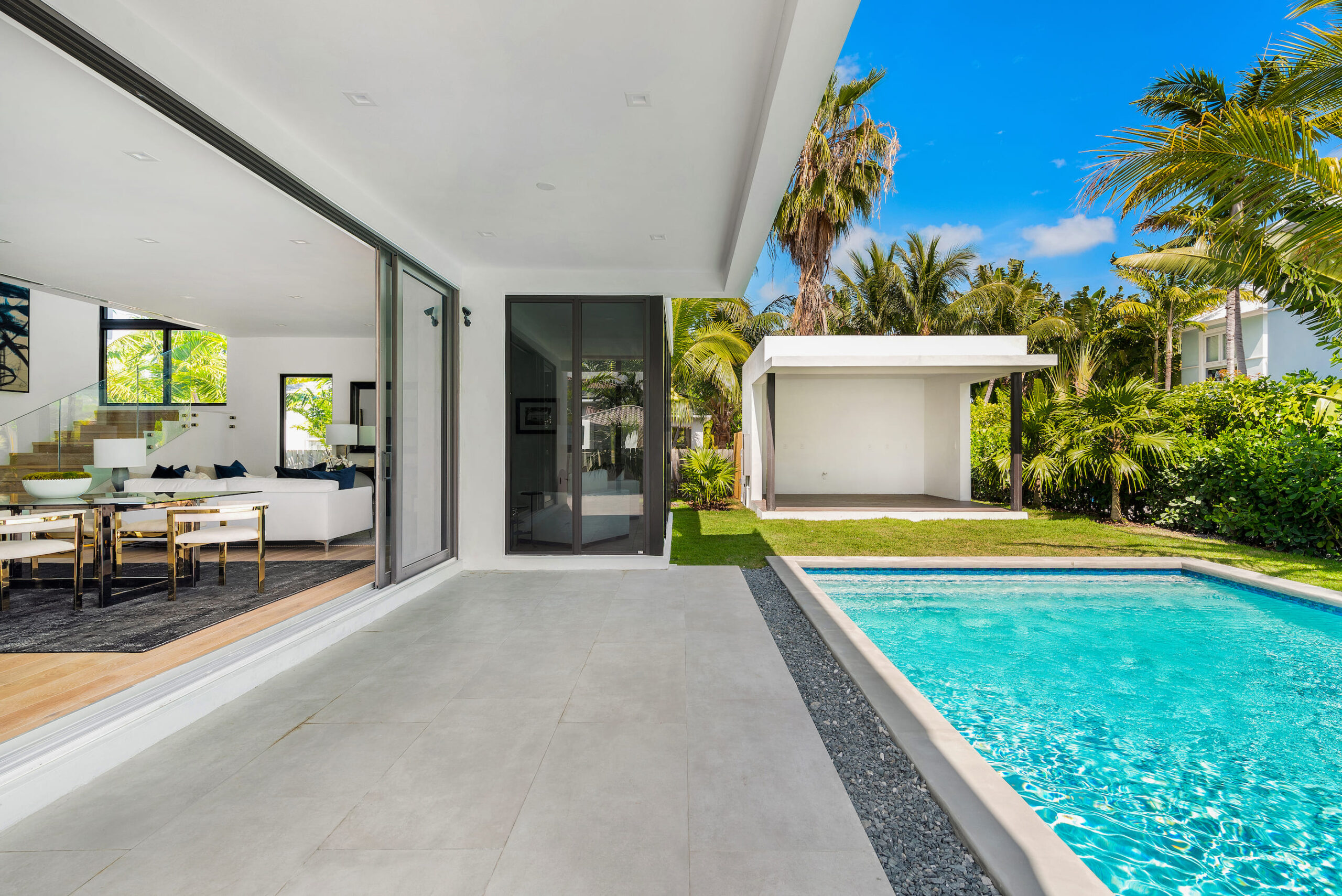 New construction contemporary smart home! Soaring ceilings & views of the sparkling pool greet you as you enter this 5BR/5 +2 BA modern masterpiece. This home boasts wide plank oak floors & an abundance of natural light throughout, creating a bright & tropical ambiance w/ oversized sliding hurricane impact doors which frame the open kitchen and living area.